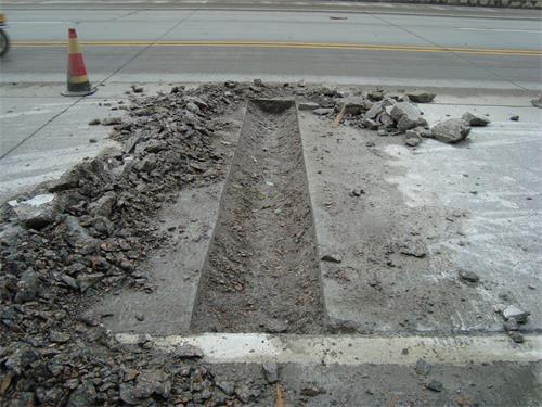 用風(fēng)鎬鑿除劃線范圍內(nèi)的混凝土,鑿除深度一般為板厚的二分之一約12cm(不得低于10cm),鑿除時(shí)應(yīng)從劃線內(nèi)區(qū)域向外鑿除,避免出現(xiàn)啃邊現(xiàn)象。如果面板已出現(xiàn)比較嚴(yán)重的錯(cuò)臺(tái)、脫空,建議先打孔壓漿后再進(jìn)行修補(bǔ)。