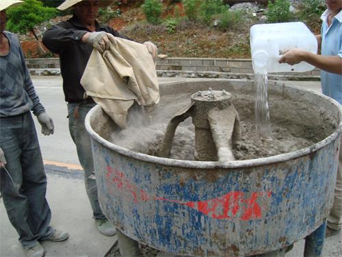 根據(jù)修補(bǔ)區(qū)域面積計(jì)算所需修補(bǔ)材料用量(以單塊路面板為單位計(jì)算),盡量做到一次性鋪裝。鋪裝工序及坑槽充分吸水飽和且無明水時(shí)進(jìn)行材料攪拌。用攪拌機(jī)先干拌SC型修補(bǔ)料和干凈碎石,修補(bǔ)料與碎石質(zhì)量比為1:0.8/1(碎石是直徑在10-30㎜連續(xù)級(jí)配石子,還要經(jīng)水清洗過),攪拌均勻后,再加干凈的水?dāng)嚢瑁铀恳詸z測(cè)報(bào)告提供的數(shù)據(jù)為依據(jù),直至攪拌均勻。觀察無干粉球和氣泡,如果仍有干粉球和氣泡,可靜止一分鐘后再攪拌,攪拌時(shí)間在3-5分鐘左右為宜,不宜時(shí)間過長(zhǎng),防止材料在攪拌機(jī)內(nèi)凝固。注意控制好水灰比,攪拌好的修補(bǔ)料不得泌水。